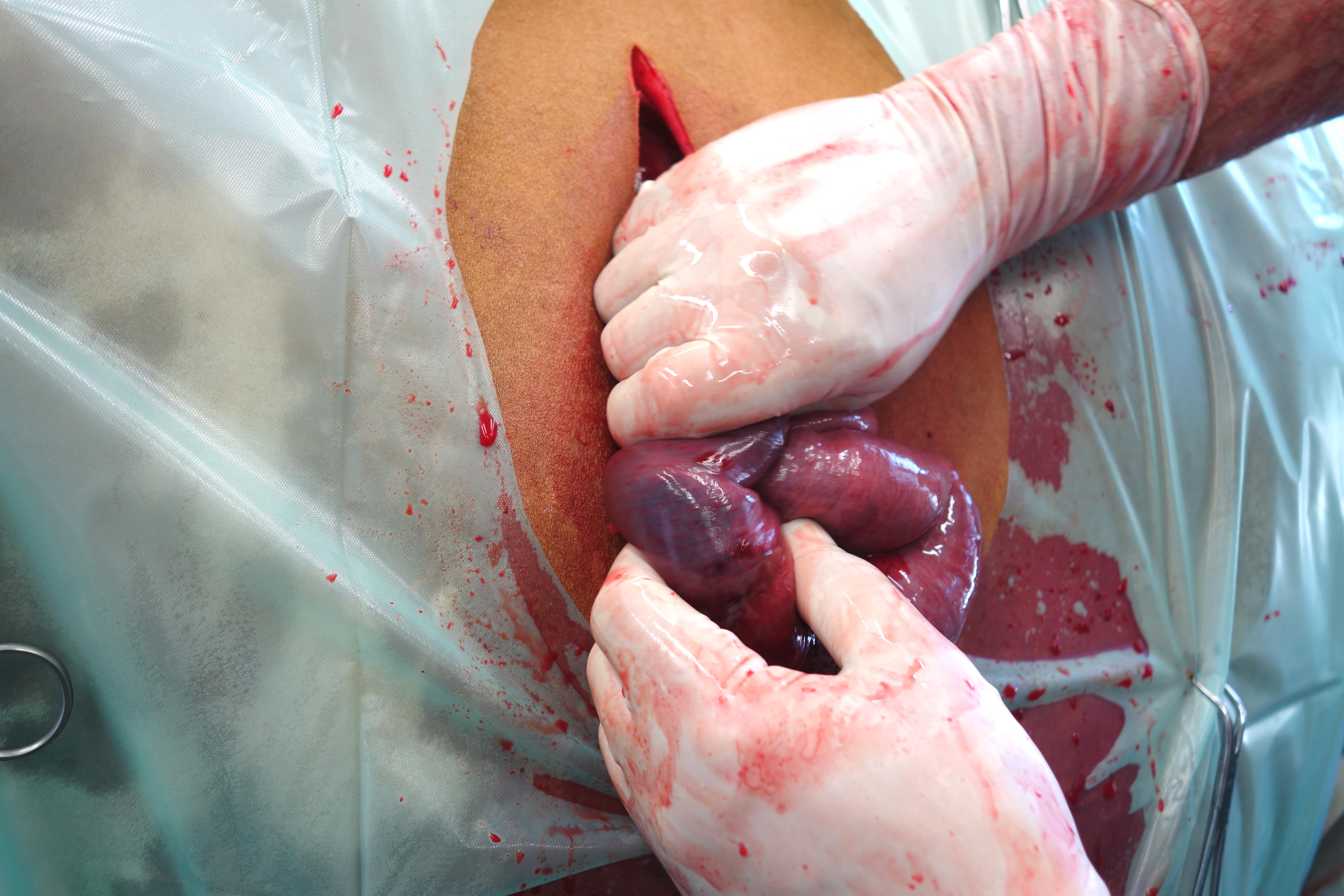 In manchen Fällen ist es nicht möglich, den betroffenen Darmabschnitt aus der Wunde heraus zu verlagern. Wenn auch ein Ablegen des Tieres nicht möglich ist, dann muss das Zerteilen des Blutkoagulums ohne Sichtkontrolle intraabdominal erfolgen.