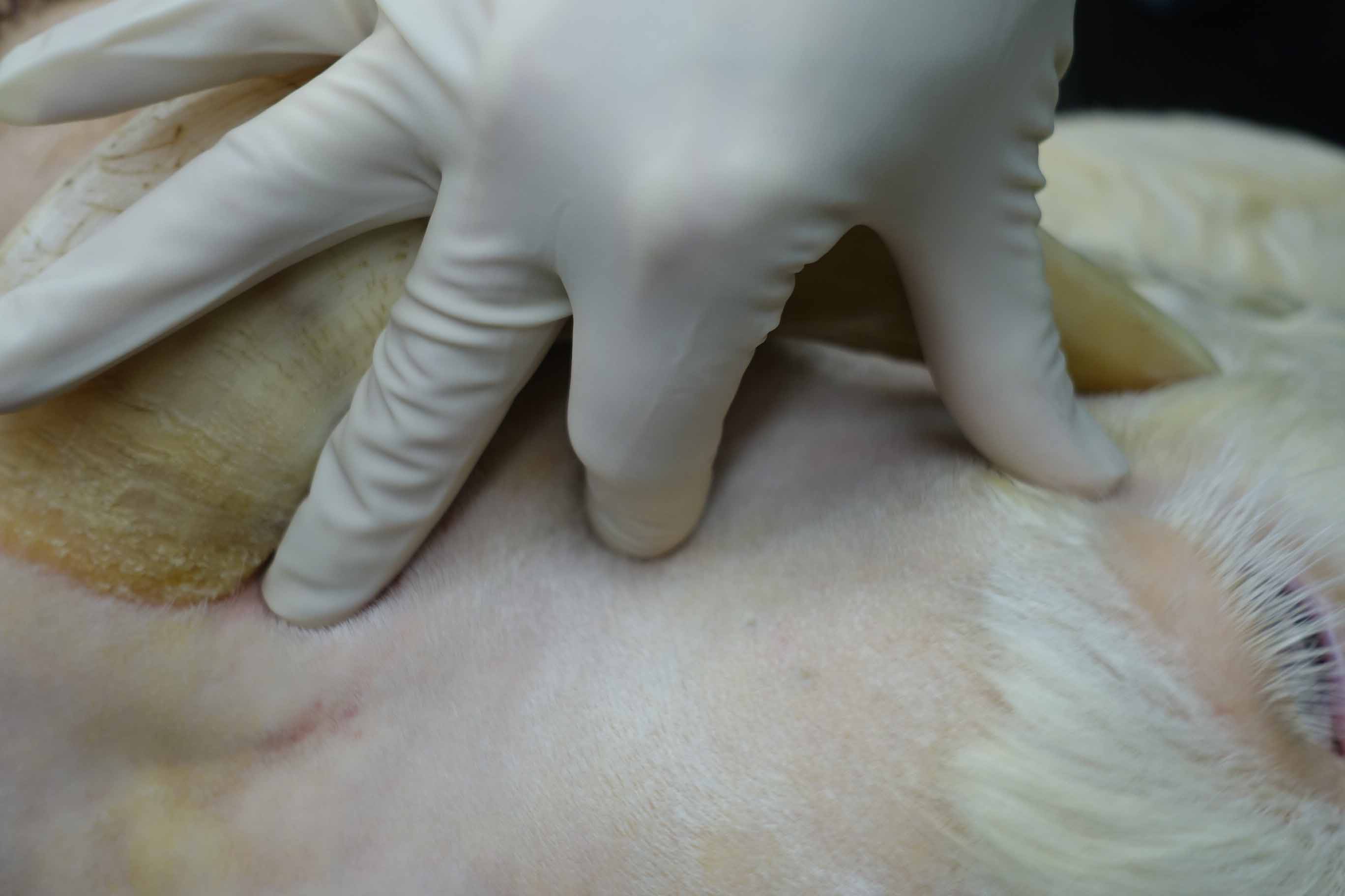 Inzision der Haut ca. 1 cm von der Hornbasis entfernt mittels Skalpell und Einlegen des Sägedrahtes.