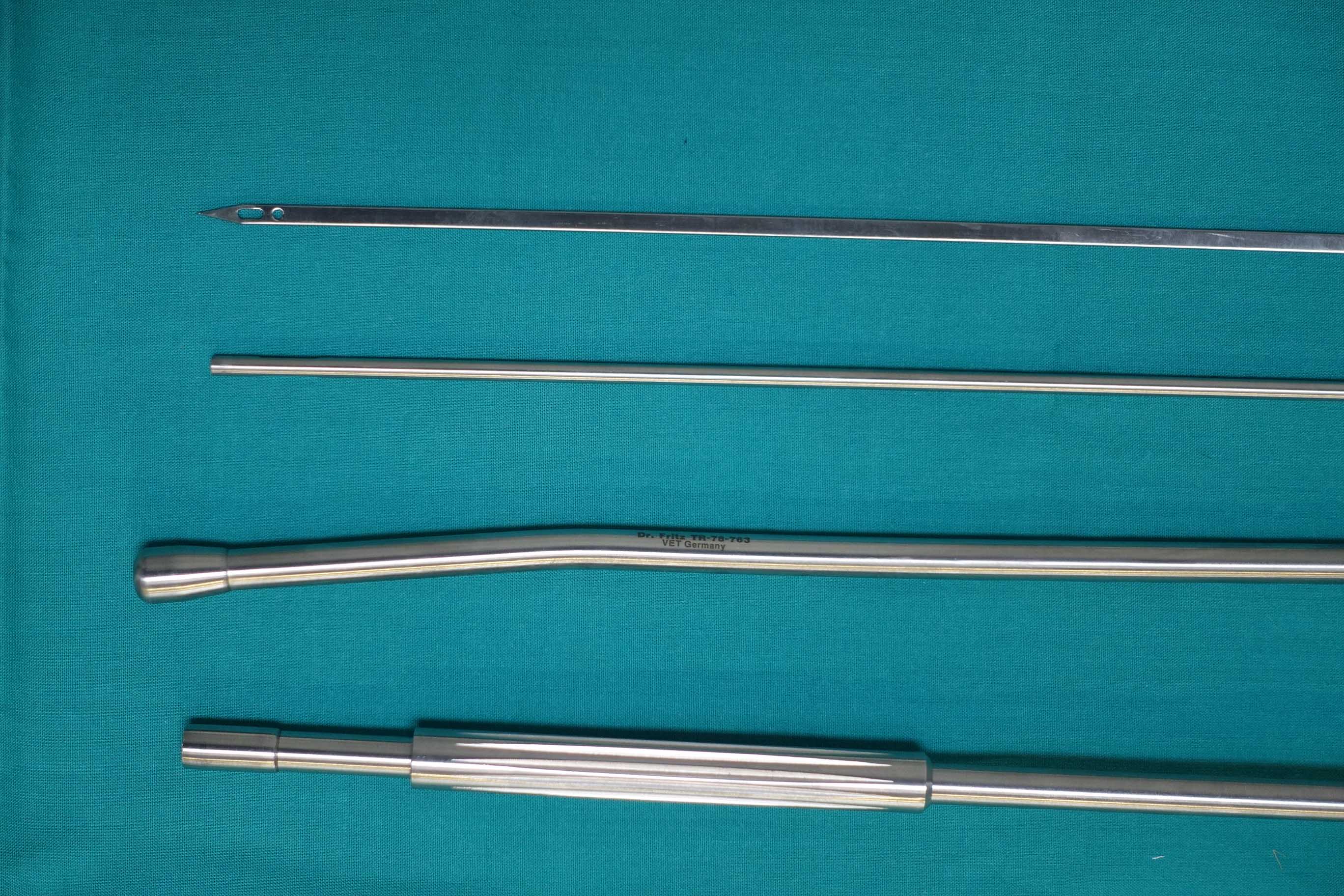 Trokarhülsenverlängerung. Zusammengesetzt ist das Instrument ca. 90 cm lang. Das