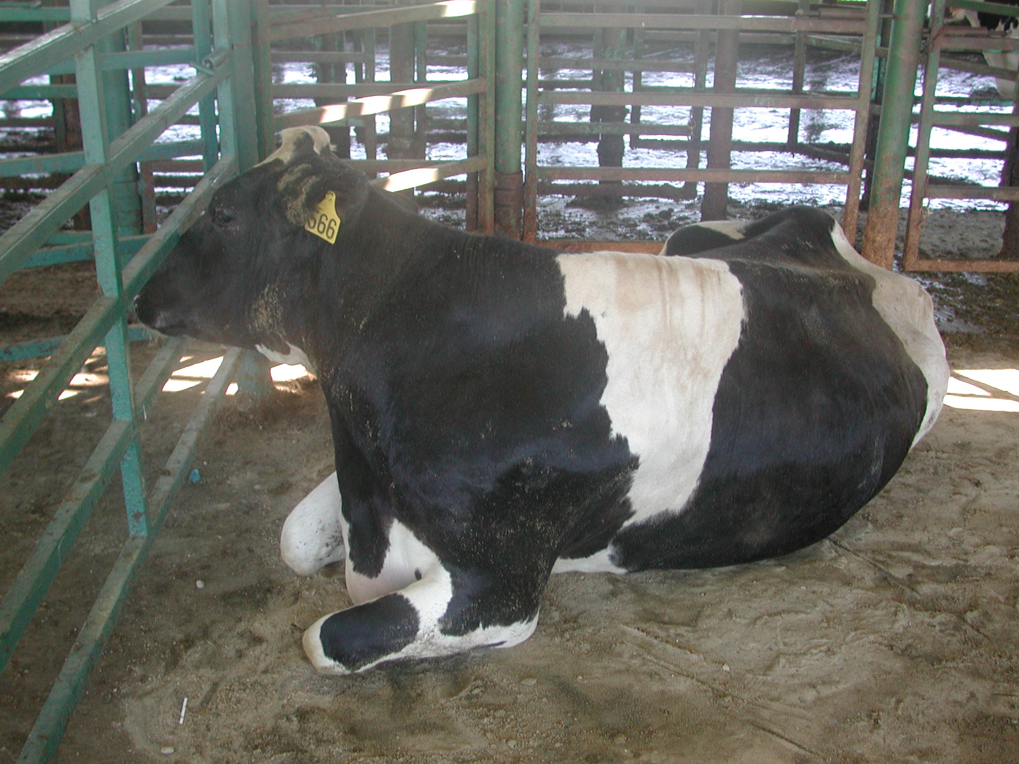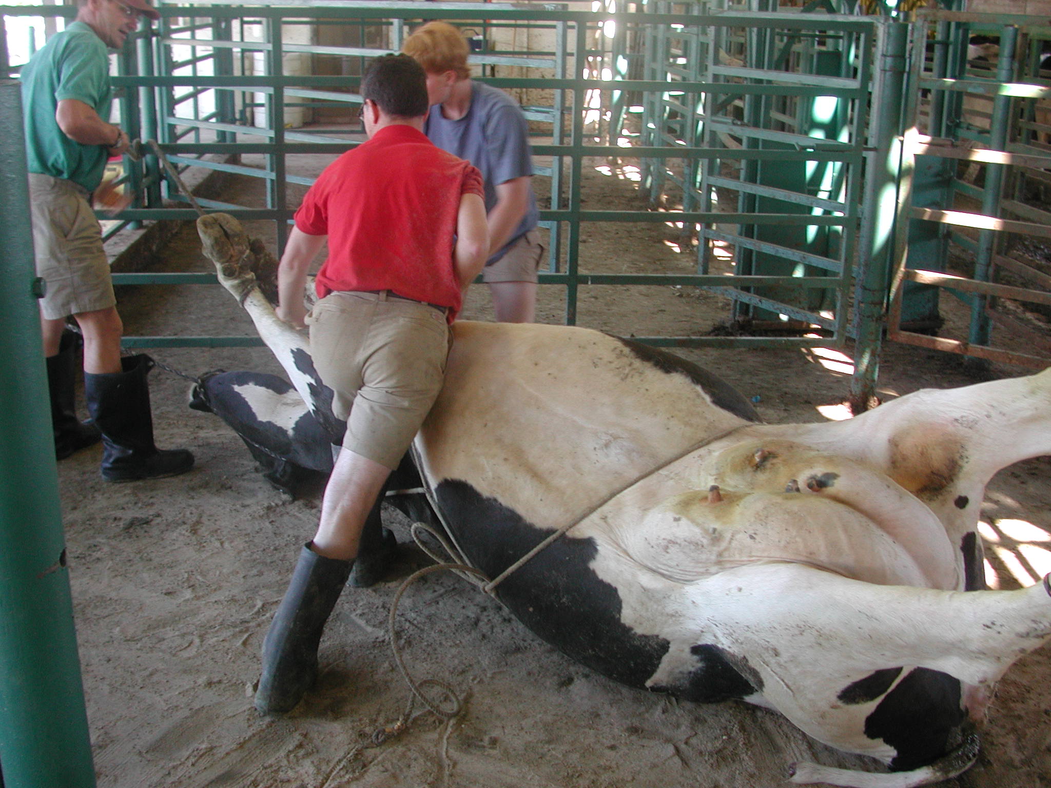 Zunächst wird die Kuh auf ihre rechte (!) Seite abgelegt (z.B.: Heuseilmethode).