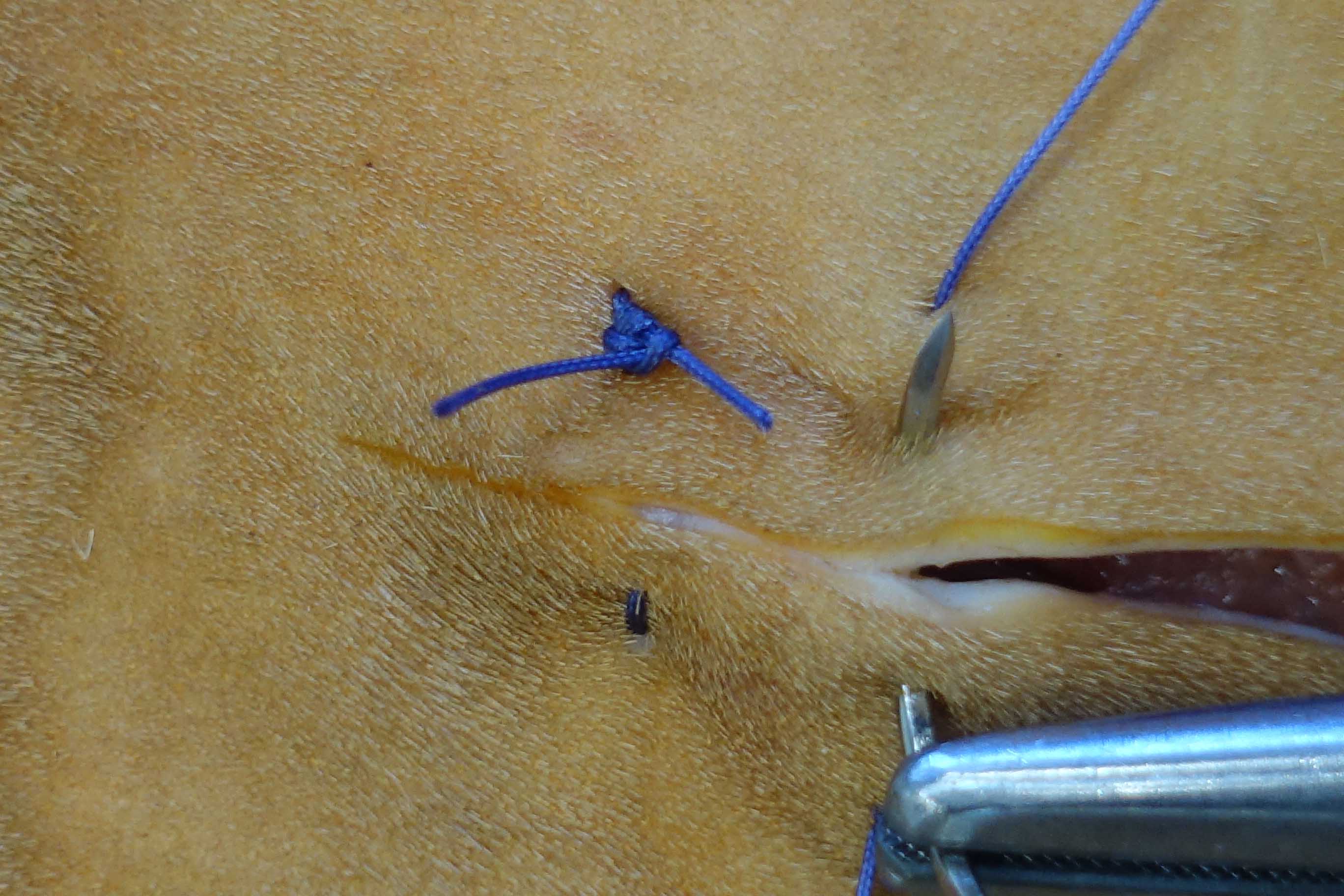 Variante B. Haut wird nur auf der Seite zweimal durchstochen, auf der die Knoten zu liegen kommen, auf der gegenüber liegenden Seite verläuft der Faden intrakutan.